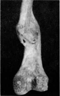 Заслуживает внимания лучевая кость из раскопок археолога В. П. Шилова в степях Задонья, найденная в погребении начала нашей эры. Мощные, местами волнистые и негладкие периостальные наслоения окутывают 2/3 диафиза лучевой кости (рис. 32). На рентгенограмме видно резко выраженное, неравномерное сужение костномозговых пространств. Нельзя обнаружить полостей, секвестров и свищевых ходов. Изменения, можно полагать, на почве первично-хронического склерозирующего остеомиелита типа Гарре.
