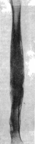 Рис. 31. Сросшийся перелом бедра, осложненный остеомиелитом, с двумя свищевыми ходами.