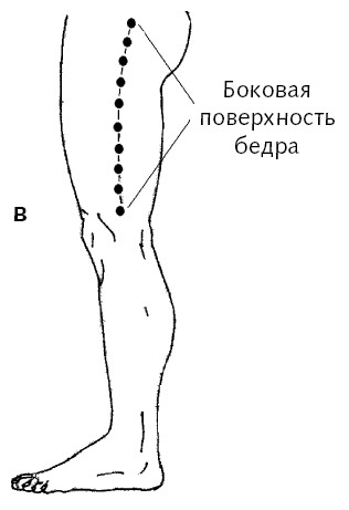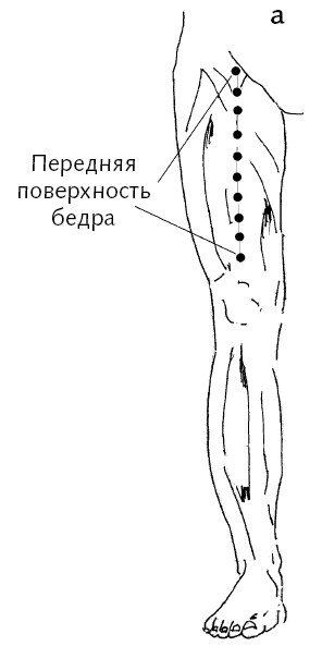 Затем, начиная с той же точки, проходим по всем десяти точкам наружной поверхности бедра вплоть до точки над коленной чашечкой. Прием плотного надавливания стандартный: один большой палец кладем на другой.