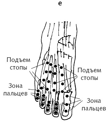 На тыле стопы выделяют шестнадцать точек, они расположены в четырех параллельных рядах по четыре точки в каждом (рис. 51, д, е). Почему так? Потому что у нас пять пальцев и, соответственно, четыре межпальцевых борозды. Мы надавливаем не на костные фаланги, а на точки, расположенные в промежутках между костной системой.