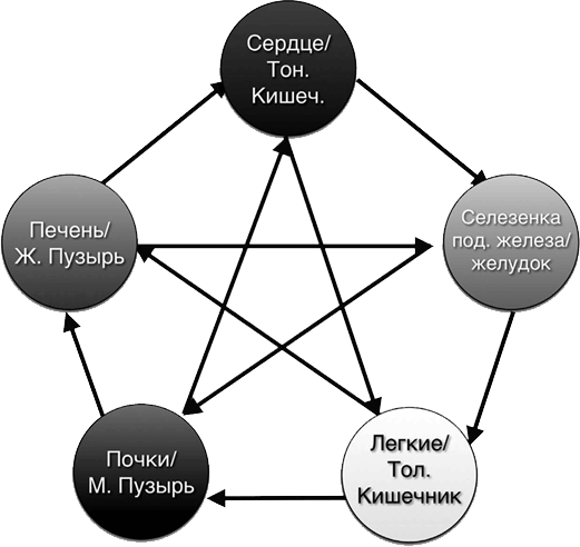 Пять из них составляют звезду контролирующих связей: от почек к сердцу, от сердца к легким, от легких к печени, от печени к селезенке. Это и есть контролирующая звезда.