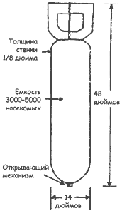 Отдавая рапорт, мы доложили, где мы сбросили 6 разорвавшихся бомб и положили также опять по той же причине, что и раньше, а именно, по причине секретности, — что четыре «неразорвавшихся бомбы» сбросили в Чунхва. Ниже приводится схема типа бактериологических бомб, которые мы применяли.