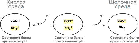 В щелочной среде усиливается диссоциация карбоксильных групп, образующиеся Н+ связывают избыток ОН–-ионов и pH сохраняется, белки выступают как кислоты и заряжаются отрицательно.
