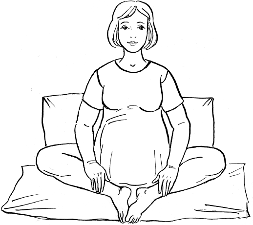 В этой позе ноги скрещены, а колени разведены, что дает большое пространство для области живота. Спиной вы можете опираться о стенку, подушку или мяч. При этом живот смещается вперед, давая отдых позвоночнику, тазовые кости раздвигаются, а мышцы промежности расслабляются. Вы можете помочь себе, руками раздвигая колени максимально широко.