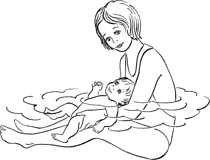 На первых 5–6 занятиях садитесь с вытянутыми ногами, опираясь спиной к прямой стороне. Возьмите ребенка и погрузите его в воду в горизонтальном положении на спинку так, чтобы над водой оставалось только его личико. Почувствуйте, что можете поддерживать ребенка в воде уверенно.