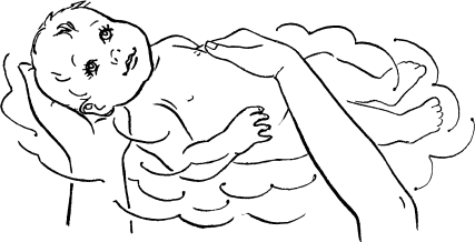 Отдых в полувертикальном положении. Согните одну руку и переложите ребенка так, чтобы спинкой и затылком он опирался на вашу грудь и плечо. Свободной правой рукой вы можете поливать его голову водой или показывать игрушки (рис. 432).