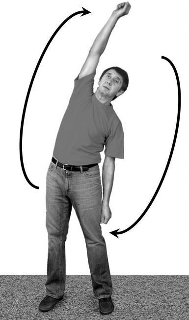 Затем на выдохе выпрямите туловище, верните руки в исходное положение (в стороны), после чего, не останавливаясь, на вдохе поднимите левую руку вертикально вверх, правую опустите и одновременно слегка наклоните туловище вправо.