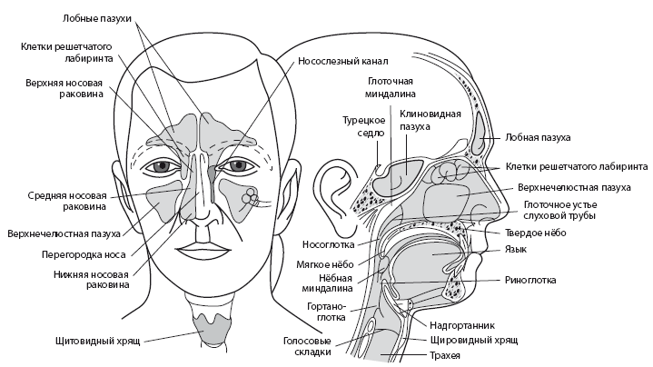 Клиновидные и лобные пазухи, клетки решетчатой кости прилежат к передней и средней черепным ямкам, орбитам.