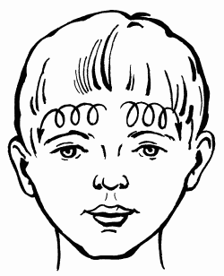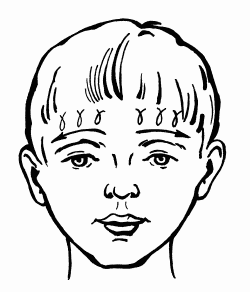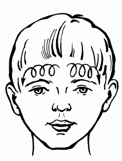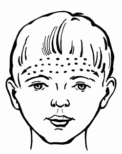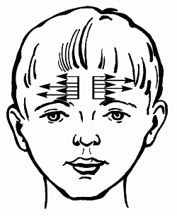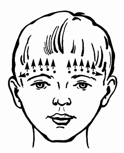Растирания осуществляются первыми фалангами указательных, средних и безымянных пальцев. При растирании кожный покров лба должен натягиваться. Растирающие движения выполняются 4–6 раз, 2 раза в день (рисунок № 36).