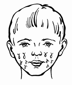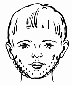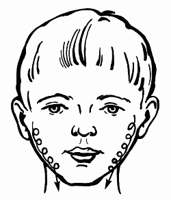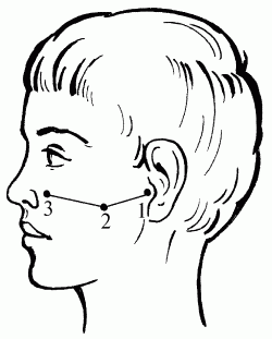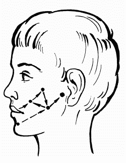 Описание: пощипывание скуловой мышцы от середины подбородка к мочкам ушей.