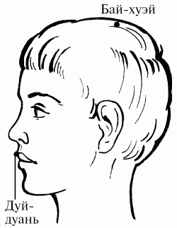 Описание: проводится поочередный массаж точек БАЙ-ХУЭЙ, ИНЬ-ЦЗЯО, ДУЙ-ДУАНЬ.