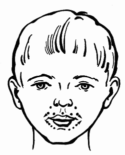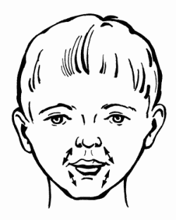 Растирающие движения следует производить указательными пальцами обеих рук. Губы должны растягиваться, и ребенок должен ощущать легкое покалывание в губах. Растирающие движения выполняют 4–6 раз, 2–3 раза в день (рисунок № 54).