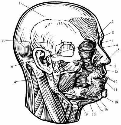 1 – черепной апоневроз: 2 – лобная мышца; 3 – часть области век круговой мышцы глаза; 4 – глазничная часть круговой мышцы глаза; 5 – медиальная связка век; 6 – латеральная сухожильная полоска; 7 – мышца гордецов; 8 – мышца, сморщивающая бровь; 9 – собственно носовая мышца; 10 – мышца, осаждающая перегородку носа; 11 – круговая мышца рта; 12– мышца, поднимающая верхнюю губу (средняя линия); мышца, поднимающая верхнюю губу и крыло носа (медиальная линия); малая скуловая мышца (латеральная линия); 13 – большая скуловая мышца; 14 – мышца, поднимающая угол рта; 15 – верхняя резцовая мышца; 16 – мышца, поднимающая нижнюю губу; 17 – мышца, опускающая угол рта; 18 – подбородочная мышца; 19 – щечная мышца; 20 – ушные мышцы.
