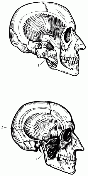 1 – собственно жевательная мышца; 2 – височная мышца; 3 – щечная мышца.