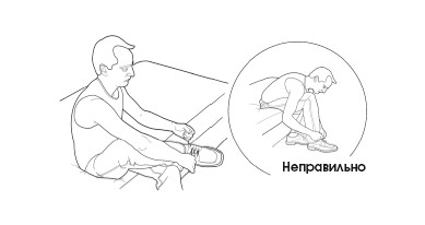 Обуваться, надевать нижнее белье, брюки и т. д. предпочтительнее в положении сидя. При этом желательно, чтобы ноги приближались к туловищу, а не наоборот (например, можно перекидывать одну ногу на другую, завязывая шнурки).
