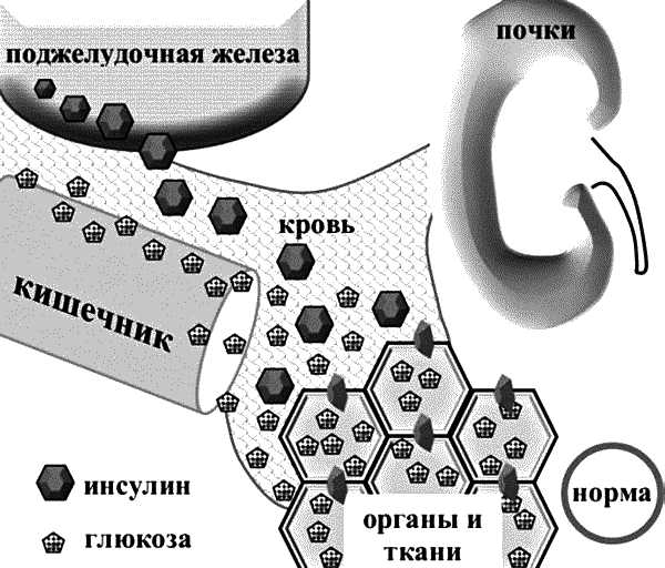 Инсулин подходит к клетке, взаимодействует с ее рецепторами, как «ключ», и открывает «замок». Глюкоза поступает внутрь клетки и участвует в синтезе необходимых веществ (рис. 7, А).