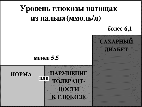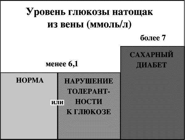 Рисунок 8. Диагностические критерии сахарного диабета. Уровень глюкозы (ммоль/л): А – натощак из пальца; Б – натощак из вены; В – через 2 часа после еды