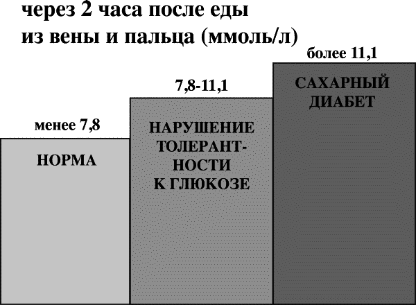 В норме через 2 часа после еды уровень глюкозы должен быть не выше 7,8 ммоль/л (рис. 8, В). Если натощак сахар крови нормальный, а через 2 часа – высокий, то устанавливается диагноз «нарушение толерантности к глюкозе».