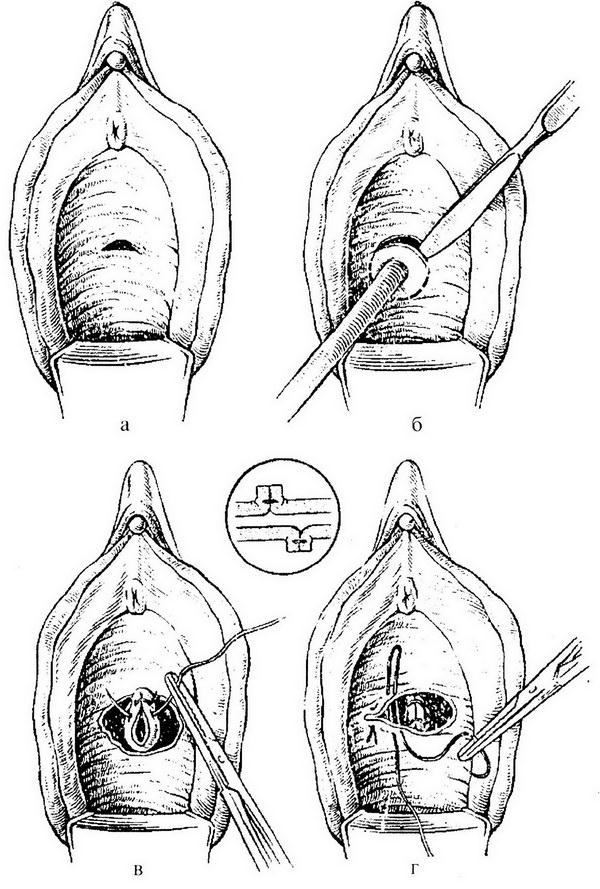 Рис. 19.4. Этапы влагалищного иссечения (а–г) пузырно–влагалищного свища (Кан Д.В., 1986)