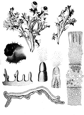 Лишайники — Lichenes — не имеют стебля и листьев, а лишь слоевище. Различают лишайники накипные в виде корочки или накипи на камнях и коре деревьев, листовые, в виде узких листиков, и кустистые, в виде разветвленных цилиндриков. В России произрастает около 2–3 тысяч лишайников, но из них в пищу употребляются лишь очень немногие.