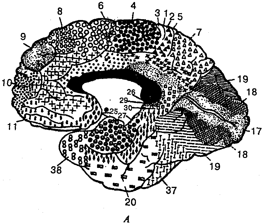 А - латеральная поверхность; Б - медиальная поверхность; числа - корковые поля