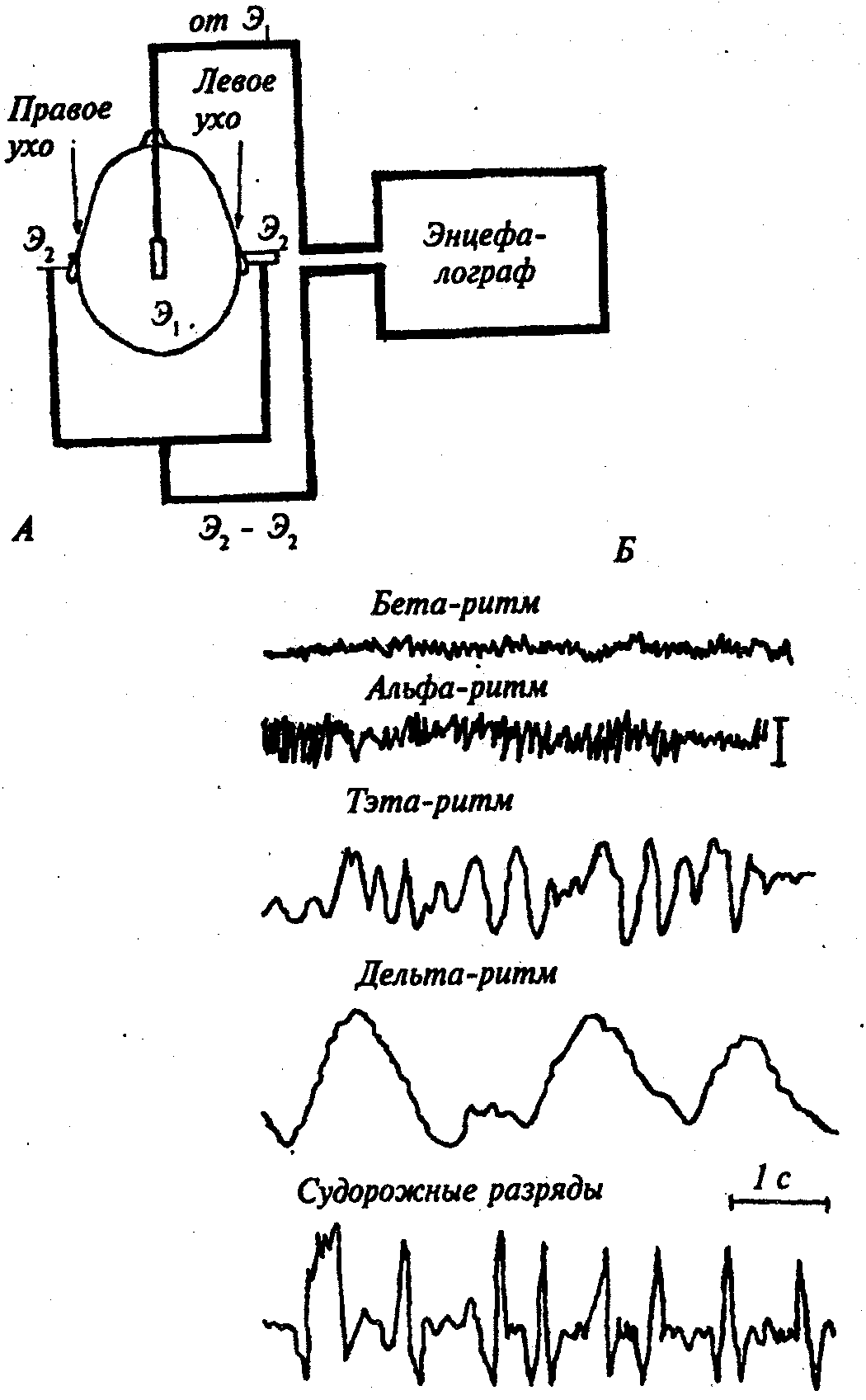 А — схема регистрации ЭЭГ; Б — основные ритмы ЭЭГ; Э1 — активный электрод; Э2 — индифферентные электроды