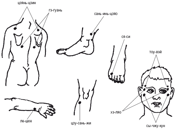 Точечный массаж проводится седативно, расслабляюще, успокаивающе. Точки массируют поочередно, в позе сидя. При купировании приступа выделяют сначала точки на конечностях, затем точки головы. С целью предупреждения обострения начинают с точек головы, воздействуют по 2–3 мин. Применяют горчичники на шею, горячие ножные ванны, на голову – холодный компресс из свежих листьев березы либо свежих или засушенных листьев и цветов сирени. Рекомендуется пить сок свежего картофеля по 50 г, есть свежие ягоды клубники.