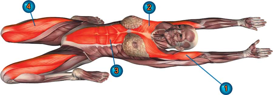 1 – бицепс, 2 – большая и малая грудные мышцы, 3 – прямая мышца живота, 4 – четырехглавая мышца бедра