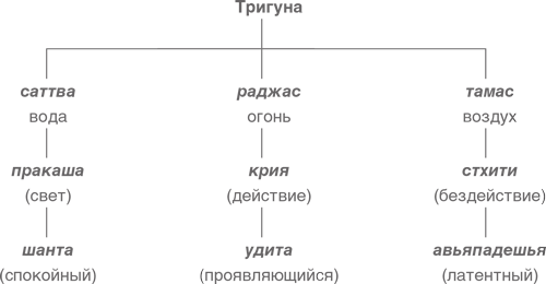 Пракрити обладает тремя свойствами (тригуна): светом (саттва), вибрацией (раджас) и инерцией (тамас). Несмотря на качественные отличия одной гуны от другой, задача у них одна – способствовать развитию садхака. Гуны – это базовые принципы природы в целом. Их называют «принципы», поскольку они обеспечивают многообразие эволюции по таким параметрам, как характер, качество и назначение. В своем источнике тригуна пребывает в состоянии совершенного, неспецифичного, неопределенного, лишенного признаков «ничто». Это мула пракрити, корень природы, который находится в идеальном равновесии. Любое существо в своем зародыше пребывает в ноуменальном, недифференцированном состоянии, лишенным всяческих признаков, и переходит в дифференцированную стадию через соединение и взаимопроникновение гун, а также путем специфических преобразований (гуна парвани) в предметы и явления, существующие на феноменальном уровне.