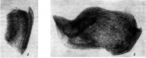 Лишь в области надколенника можно было обнаружить локальное преждевременное старение, которого не имелось в скелете кисти, голени и стоп, за исключением правой пяточной кости. В последней наблюдались окостенение места прикрепления Ахиллова сухожилия (так называемая верхняя шпора) и частичное окостенение места прикрепления подошвенного апоневроза. Односторонность этого резкого изменения рельефа пяточной кости (рис. 104, Б) убеждала в том, что это такое же локальное преждевременное старение, как и в надколеннике, не иллюстрирующее возрастных особенностей. Изменения в надколеннике резче выражены, возможно в результате частого и продолжительного стояния на коленях во время тяжелой работы. Это результат суммирования микротравм. Скорее всего такую работу, стоя на коленях, выполняла женщина.