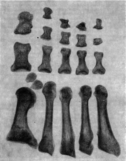 Рис. 105. Скелет правой стопы из грота Киик-Коба; нерасчлененная трапециевидная средняя фаланга V пальца и 2 патологически измененные концевые фаланги.