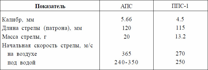 В данное время на вооружении специальных подразделений Военно-морского флота России состоят мощные образцы стрелкового огнестрельного оружия, способного прицельно поражать цели как под водой, так и на суше. Это автомат подводный специальный (АПС) (рис. 7) и пистолет подводный специальный (ППС) (рис. 8) калибром 5.66 и 4.5 мм соответственно. Оружие имеет ряд конструктивных особенностей, позволяющих вести прицельный огонь на большом расстоянии под водой. Прежде всего это касается конструкции патрона, в котором используется специальный медленно горящий порох и пуля увеличенной длины и массы, что дает возможность добиться ее устойчивого продвижения в воде на значительные дистанции и достигать сохранения убойной силы до 30 м. Для сравнения – в воде убойная сила пули, выпущенной из автомата Калашникова (калибр 7.62 мм), всего около 1.5 м [Новосельцев О. В., 1990].
