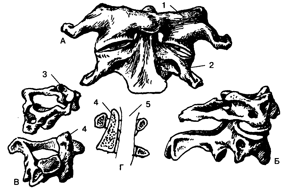 Атлант и эпистрофей: А – вид спереди; Б – вид справа; В – раздвинутые позвонки; Г – схема соединения; 1 – атлант; 2 – эпистрофей; 3 – суставные поверхности, соединяющиеся с мыщелками черепа; 4 – «зуб» эпистрофея, вокруг которого вращается атлант; 5 – спинной мозг