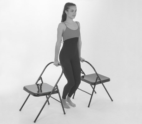 Плавающая Тадасана: адаптированный и обычный варианты. Поставьте два стула спинками друг к другу на таком расстоянии, чтобы вам было удобно между ними стоять. Держите локти распрямленными, ладонями обопритесь на верхнюю часть спинок. Слегка согните ноги в коленях так, чтобы часть веса тела, которая приходится на ноги, перешла на руки. Расслабьте мышцы живота. Именно этот момент ликвидации напряжения в мышцах живота имеет решающее значение для получения позитивного эффекта от данной позы. Без такой релаксации эта поза не сможет облегчить боль в крестцово-подвздошном суставе.