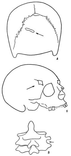 Рис. 121. А — свежий след ранения рубящим оружием по затылочной кости Андрея Боголюбского; Б — свежий след ранения колющим оружием в лобную кость; В — врожденное срастание II и III шейных позвонков (вид сзади).