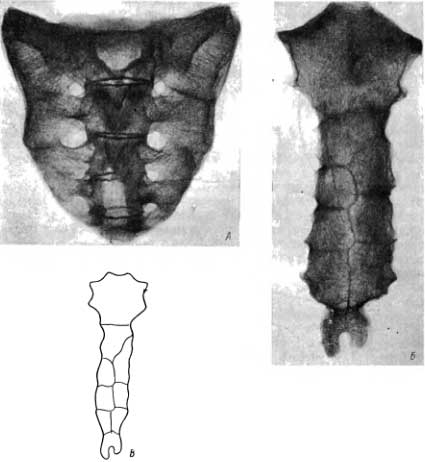 Рис. 122. А — широкий и короткий крестец с сохранением сегментарного строения; Б — сохранение сегментарного строения грудины; В — схема с предыдущей рентгенограммы.