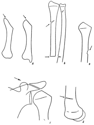 Рис. 123. А — рубящим оружием отсечена часть головки II и III пястных костей; Б — двойное ранение рубящим оружием обеих костей предплечья; В — ранение рубящим оружием плечевой кости; Г — удар рубящим оружием по надплечью и плечу; Д — ранение рубящим оружием бедренной кости.