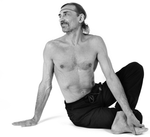 Корпус и голова за счет скручивания в области талии разворачиваются вправо. Левая рука кладется сверху на стопу, а правая, развернутая пальцами от себя, упирается ладонью в пол сзади.