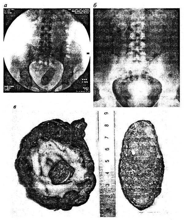 а – обзорная урограмма. В проекции лоханки правой почки фрагмент почечной спирали стента. Камень в мочевом пузыре на пузырной спирали стента; 6 – экскреторная урограмма той же больной. Сморщенная правая почка, уретерогидронефроз справа, мочевой пузырь в виде песочных часов, камень в мочевом пузыре. Видны почечная и пузырная спирали стента; в – макропрепарат правой почки с камнем на почечной спирали стента и камень мочевого пузыря на пузырном конце стента.