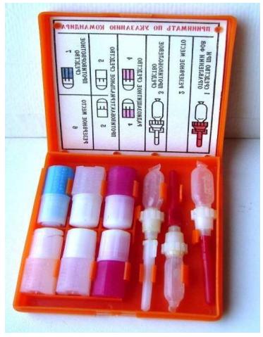 Содержит средства для профилактики и лечения последствий воздействия оружия массового поражения, а также для ослабления первичной реакции на облучение, в целях сохранения боеспособности личного состава. Представляет собой набор лекарственных препаратов и антидотов в таблетках (пеналах) и растворах (шприц-тюбиках), размещенных в полиэтиленовом футляре (рис.5). Препараты, содержащиеся в шприц-тюбиках и пеналах, принимают (вводят) при непосредственной угрозе или сразу после применения противником оружия массового поражения в порядке само- или взаимопомощи. Лекарственные средства, содержащиеся в аптечке, применяются по указанию командира (начальника) или самостоятельно. Средства в аптечке размещены в строго определенной последовательности, в специально отведенных гнездах и отличаются друг от друга по цвету упаковки и форме, это облегчает нахождение нужного препарата.