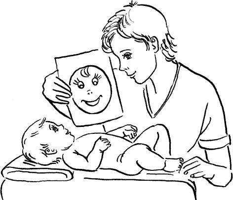 Нарисуйте на листе бумаги веселую улыбающуюся рожицу. Поднесите этот листок бумаги к лицу малыша на расстояние 40–50 см, и вскоре вы увидите, что он будет улыбаться нарисованной рожице так же, как и вам.