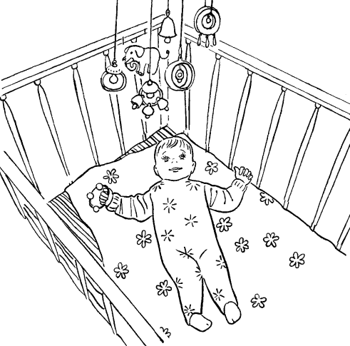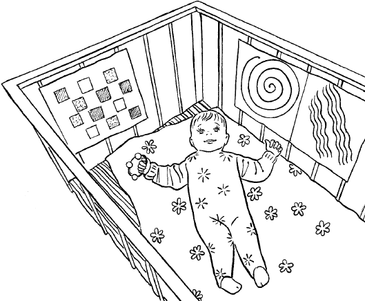 На стенках кроватки можно разместить картинки с разными узорами. Например, в виде шахматной доски, спирали, круги и волнистые полосы. Используя гуашь или другие яркие краски, нарисуйте сами линии шириной 1 см.