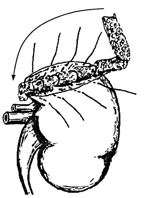В ходе ревизии поврежденной почки необходимо получить полное представление о характере повреждения. Уточняется степень и локализация разрыва, состояние лоханки и чашечек, оценивается интенсивность кровотечения из сосудов паренхимы почки. Для этого надо убрать сгустки крови из раны почки. Это может сопровождаться усилением кровотечения из раны. Во избежание дополнительной потери крови и создания оптимальных условий для ревизии раны почки необходима пальцевая компрессия почечной артерии. Это приводит к остановке кровотечения из раны почки, создаются условия для оценки степени повреждения, уточнения состояния чашечно–лоханочной системы и выбора адекватного объема вмешательства.