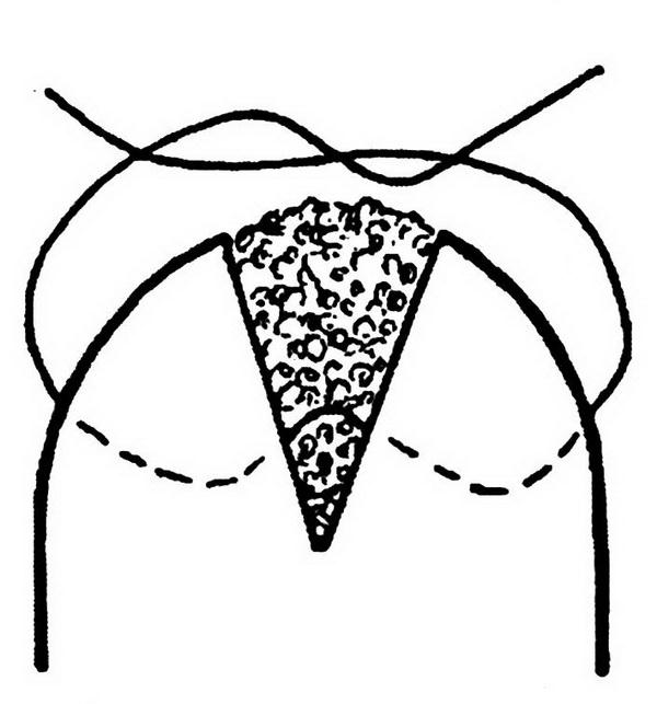 Рис. 8.5. Схема наложения швов на рану верхнего полюса почки и помещение лоскута жировой клетчатки под петлями нитей у дна раны