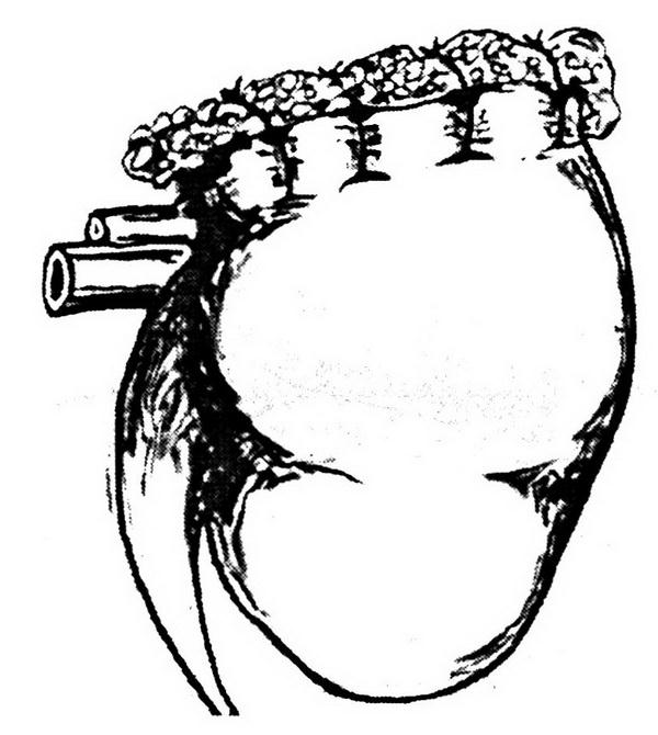 Рис. 8.7. Вид ушитого разрыва верхнего полюса почки с использованием жировой прокладки по нашей методике