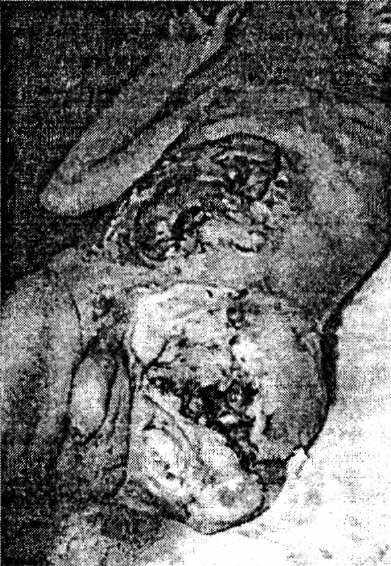 Рис. 25. Множественные ранения брюшной полости, левого бедра с развитием клостридиальной инфекции, эвентрация внутренних органов, экзартикуляция бедра в тазобедренном суставе (по Е. А. Решетникову)