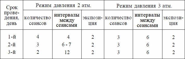 В последние годы гипербарическая оксигенация с успехом применяется в комплексной терапии анаэробной инфекции. Основанием для ее назначения служит антибактериальное действие гипероксии, а также наличие гипоксии в клинике заболевания. Может быть рекомендована следующая схема лечения (табл. 2).