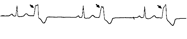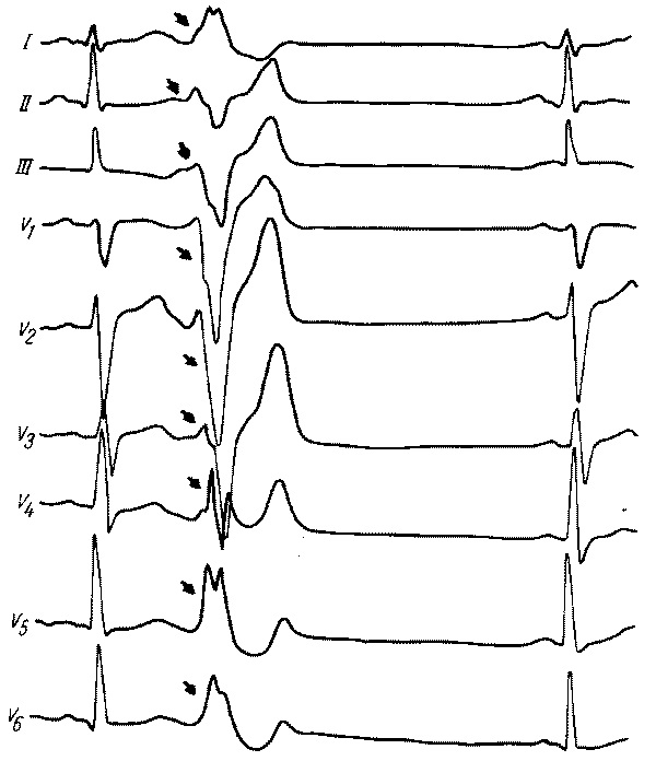 1. Если экстрасистолический импульс из АВ-соединения одновременно достигает предсердий (ретроградно) и желудочков (антеградно), то на ЭКГ будет неизмененный или несколько деформированный экстрасистолический комплекс QRS без зубца Р (последний наслаивается на комплекс QRS).