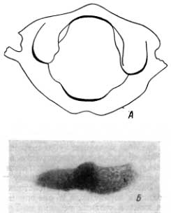 Рис. 107. А — атлант ребенка-неандертальца; Б — фрагмент области синостоза седалищной и лонной костей.