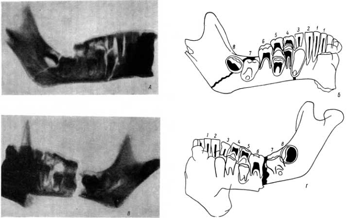Рис. 108. А — левая часть сломанной нижней челюсти; Б — схема с рентгенограммы; В — правая часть сломанной нижней челюсти; Г — схема с рентгенограммы.